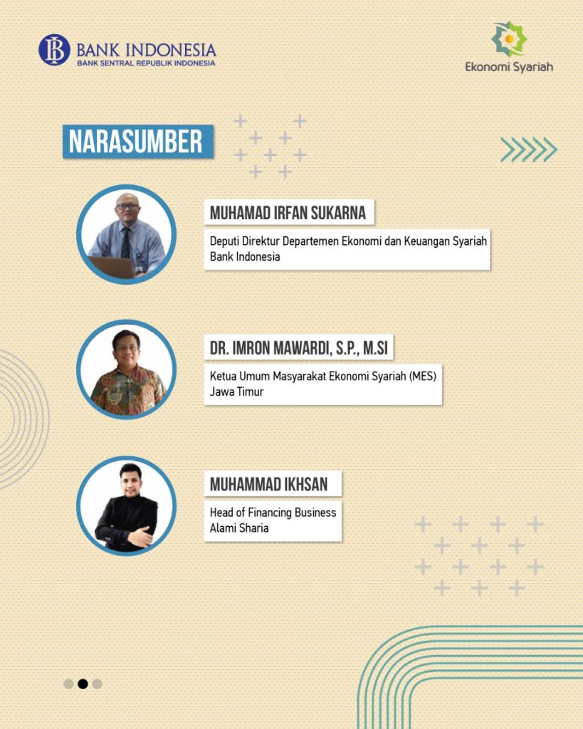 Hadir sebagai pemateri Deputi Direktur Departemen Ekonomi dan Keuangan Syariah Bank Indonesia Muhamad Irfan Sukarna, Head of Financing Business ALAMI Muhammad Ikhsan, dan Ketua Umum Masyarakat Ekonomi Syariah (MES) Jawa Timur Dr. Imran Mawardi, SP. M.Si. Wakil Gubernur Jawa Timur Emil Elistianto Dardak juga turut memberikan sambutan dalam acara tersebut.