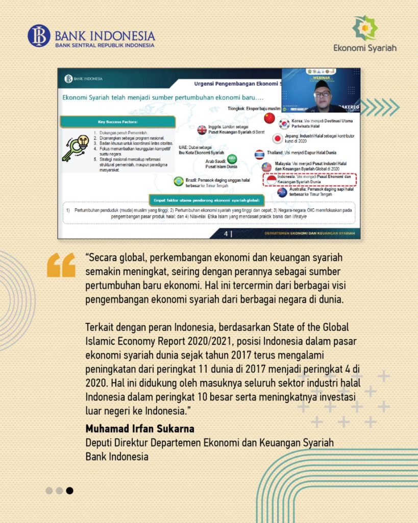 Webinar nasional ini diharapkan dapat memperkaya pengetahuan dan pemahaman seluruh peserta tentang tren dan perkembangan ekonomi syariah saat ini. Semakin tinggi tingkat literasi ekonomi syariah masyarakat, diharapkan semakin besar pula tingkat penggunaan produk dan jasa halal (halal lifestyle) yang pada akhirnya akan menjadikan peran ekonomi syariah menjadi lebih nyata dalam mendorong perekonomian nasional.