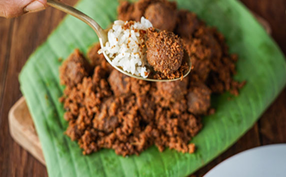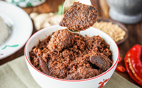 Rendang is a beef dish rich in spicy and herbal flavors indigenous to the Minangkabau region of West Sumatra, and one of the most famous representatives of Indonesian cuisine. The key to preparing rendang is time: chunks of beef are stewed in coconut milk for at least four hours until the coconut milk is completely absorbed into the meat and the beef takes on a darkish color.